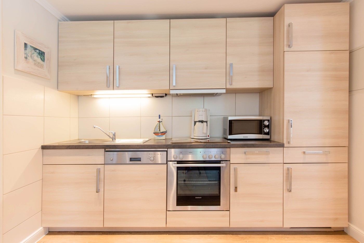 Die offene Küche ist komplett ausgestattet, vom Wohnbereich gelangen Sie auf die möblierte Terrasse mit eigenem Garten. Ein Kamin sorgt für gemütliche Stunden, während Gartenmöbel, Liegen und der Kinderspielplatz für einen entspannten Ostseeurlaub bereitstehen.