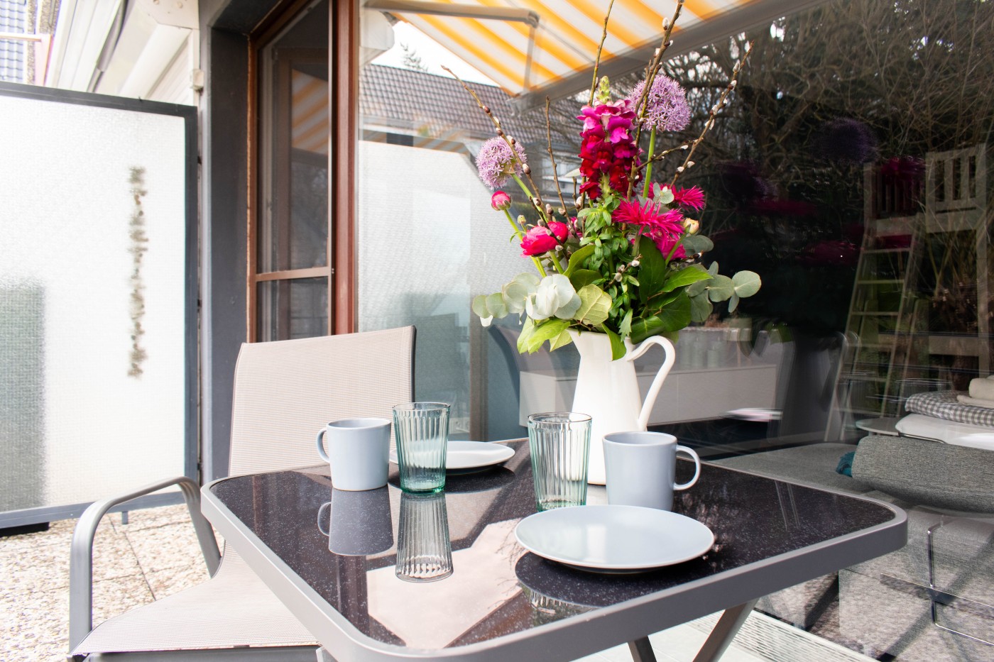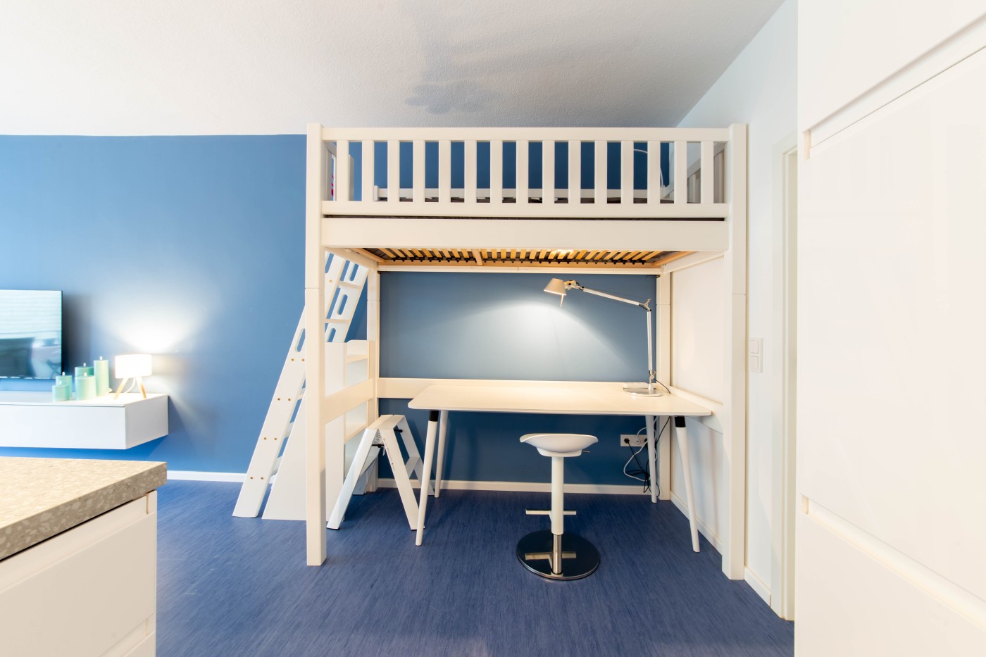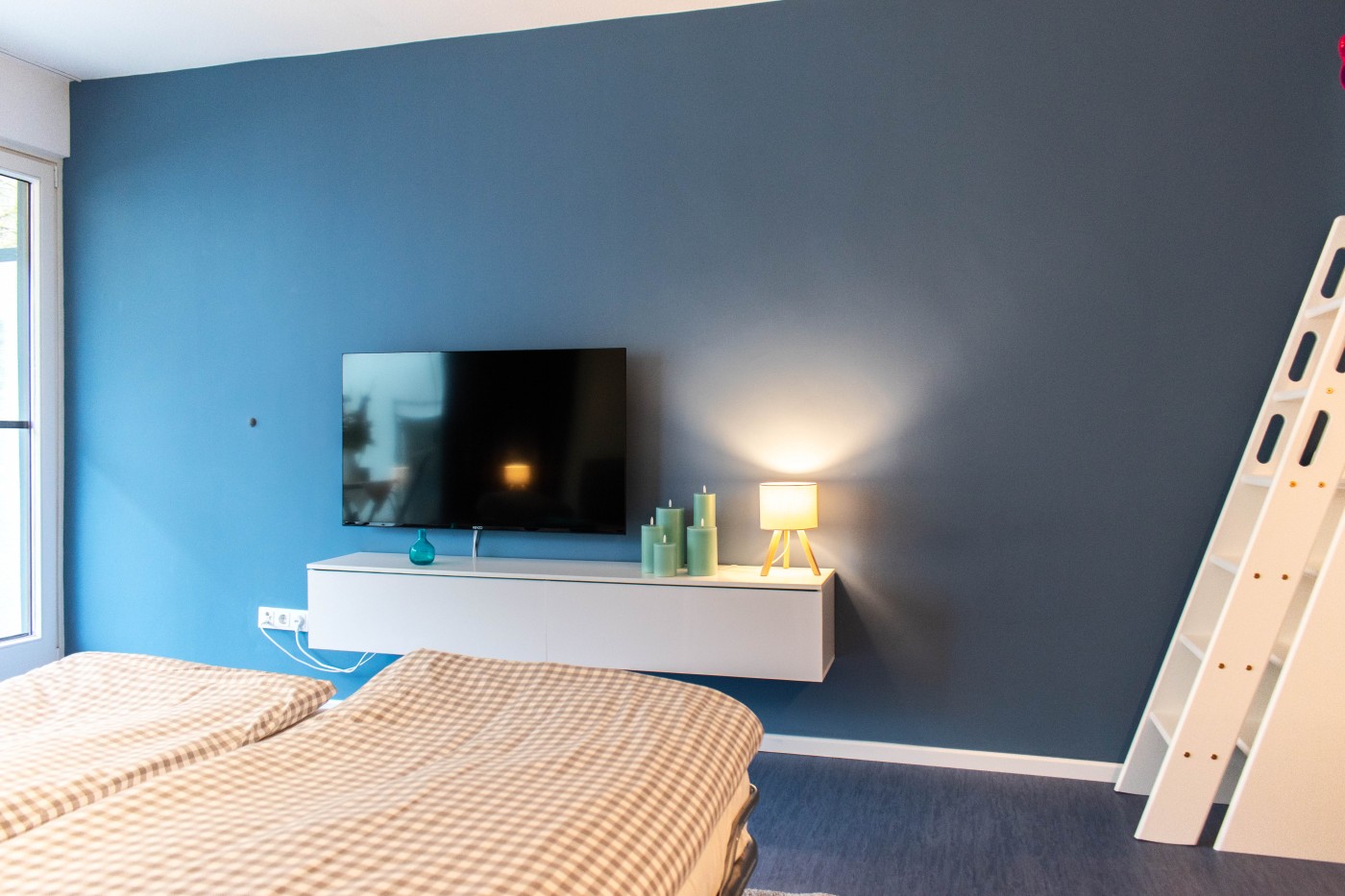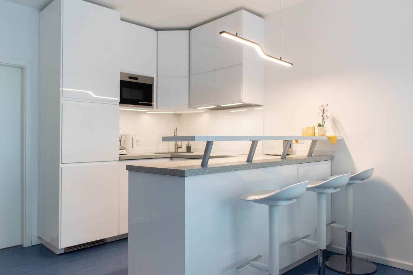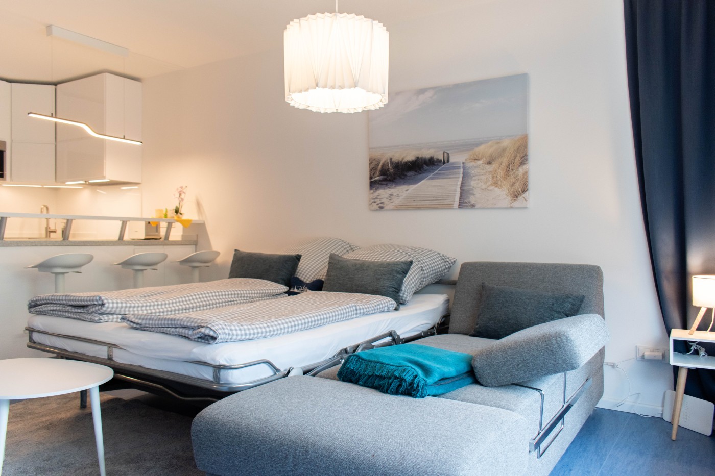 Die minimalistische Einrichtung ist modern und stilvoll. Die Kombination aus Weiß und Blautönen schafft ein maritimes und zeitloses Ambiente. Bei der Dekoration wurde der Fokus auf das Wesentliche gelegt, Schlichtheit und Funktionalität stehen im Vordergrund.
