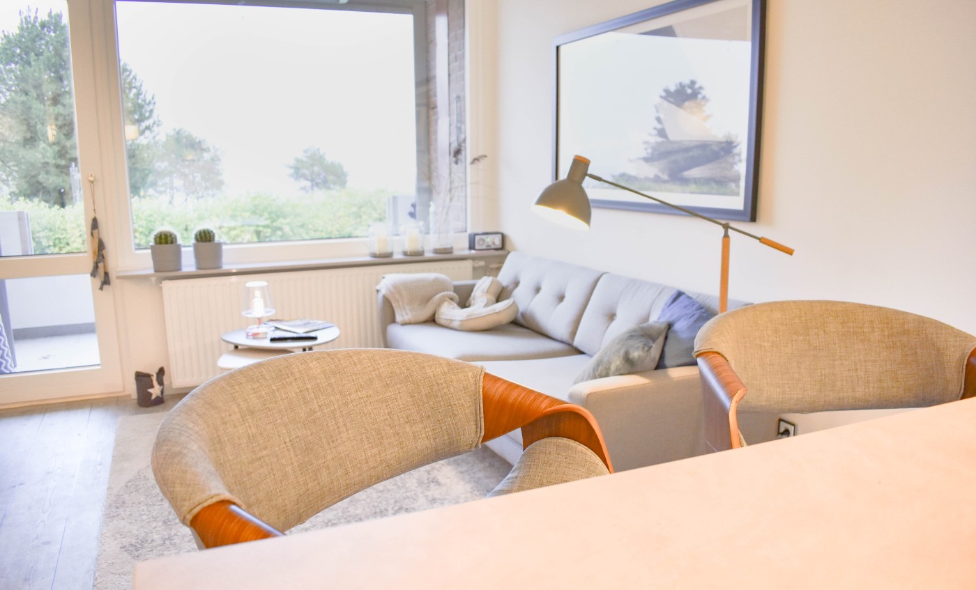 Die stylisch und maritim eingerichtete Zweizimmerwohnung mit separatem Schlafzimmer, Balkon und Terrasse bietet Platz für zwei Gäste. Im Wohnraum wird der Platz ideal genutzt. Eingerichtet ist dieser mit einer gemütlichen Couch, einer Sitzecke mit Platz für vier Personen und der Küchenzeile, welche mit den zwei Barhockern als perfekter Frühstücksplatz dient. Die kleine aber feine Küche lässt keine Wünsche offen und ist mit modernen und hochwertigen Geräten ausgestattet. Außerdem gibt es im Wohnraum durch die Einbauschränke reichlich Stauraum. Der Balkon ist nach Osten ausgerichtet, somit können Sie von hier den Sonnenaufgang genießen. Vom Schlafzimmer mit dem bequemen Boxspringbett (1,90er Breite) können Sie die westlich ausgerichtete Terrasse erreichen. In den beleuchteten Kleiderschränken können Sie Ihr gesamtes Gepäck verstauen. Das moderne und innenliegende Badezimmer mit WC verfügt über eine große ebenerdige Dusche, einen beleuchteten Spiegel und eine Handtuchheizung.