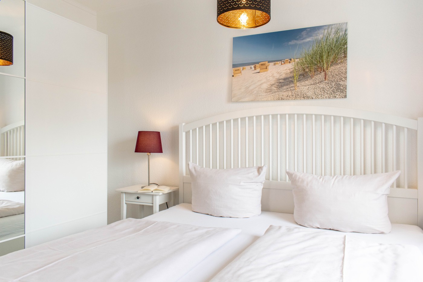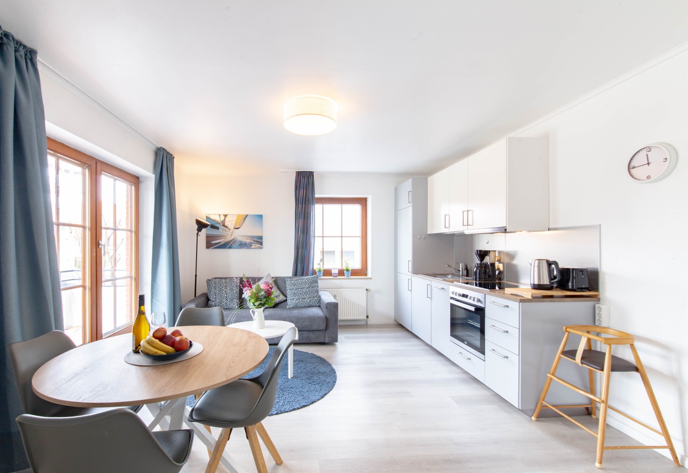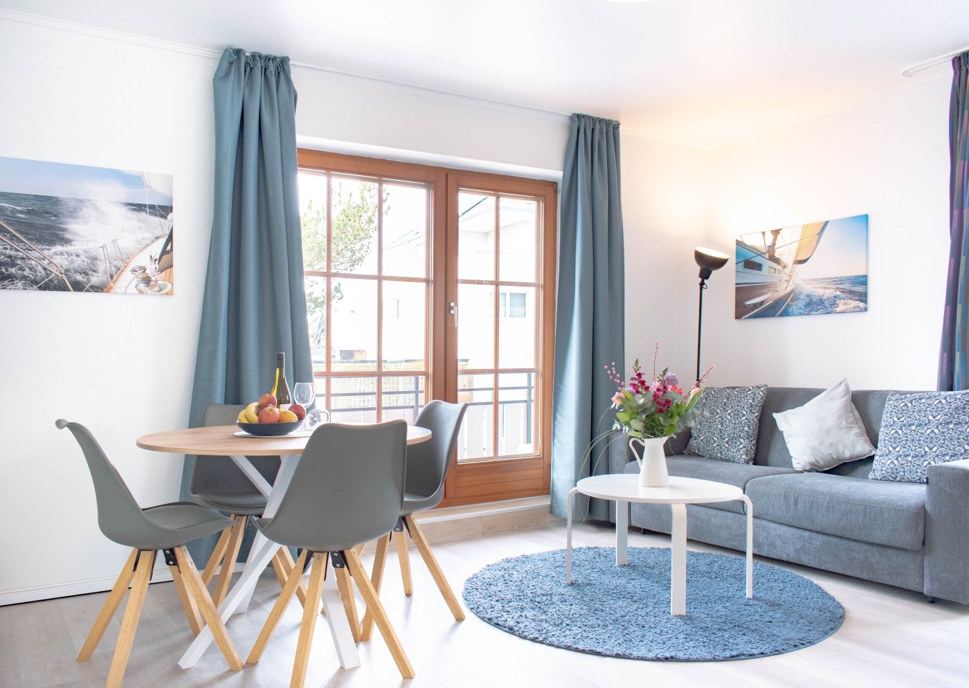 Die Wohnung überzeugt mit nordischem Flair und der liebevollen, durchdachten Einrichtung. Der offene Wohn- und Essbereich ist lichtdurchflutet, modern eingerichtet und clever zoniert. Die voll ausgestattete Küche bietet beste Voraussetzungen für gesellige Kochabende. Eine bequeme Sofalandschaft schafft den idealen Ort für spannende Filmabende. Sie kann auch als ausziehbare Schlafcouch mit integrierter Matratze (1,40m x 2,00m) genutzt werden. Vom Wohnbereich gelangen Sie auf den möblierten Balkon. Das separate Schlafzimmer verfügt über ein gemütliches Doppelbett (1,80 m Breite) und einem großen Kleiderschrank mit einer Menge Stauraum. Das Tageslichtbad ist mit einer großen Eckdusche und einem WC ausgestattet. Eine Waschmaschine und ein Trockner stehen Ihnen im Gemeinschaftskeller der Anlage zur Verfügung, perfekt für den Familienurlaub an der Ostsee.