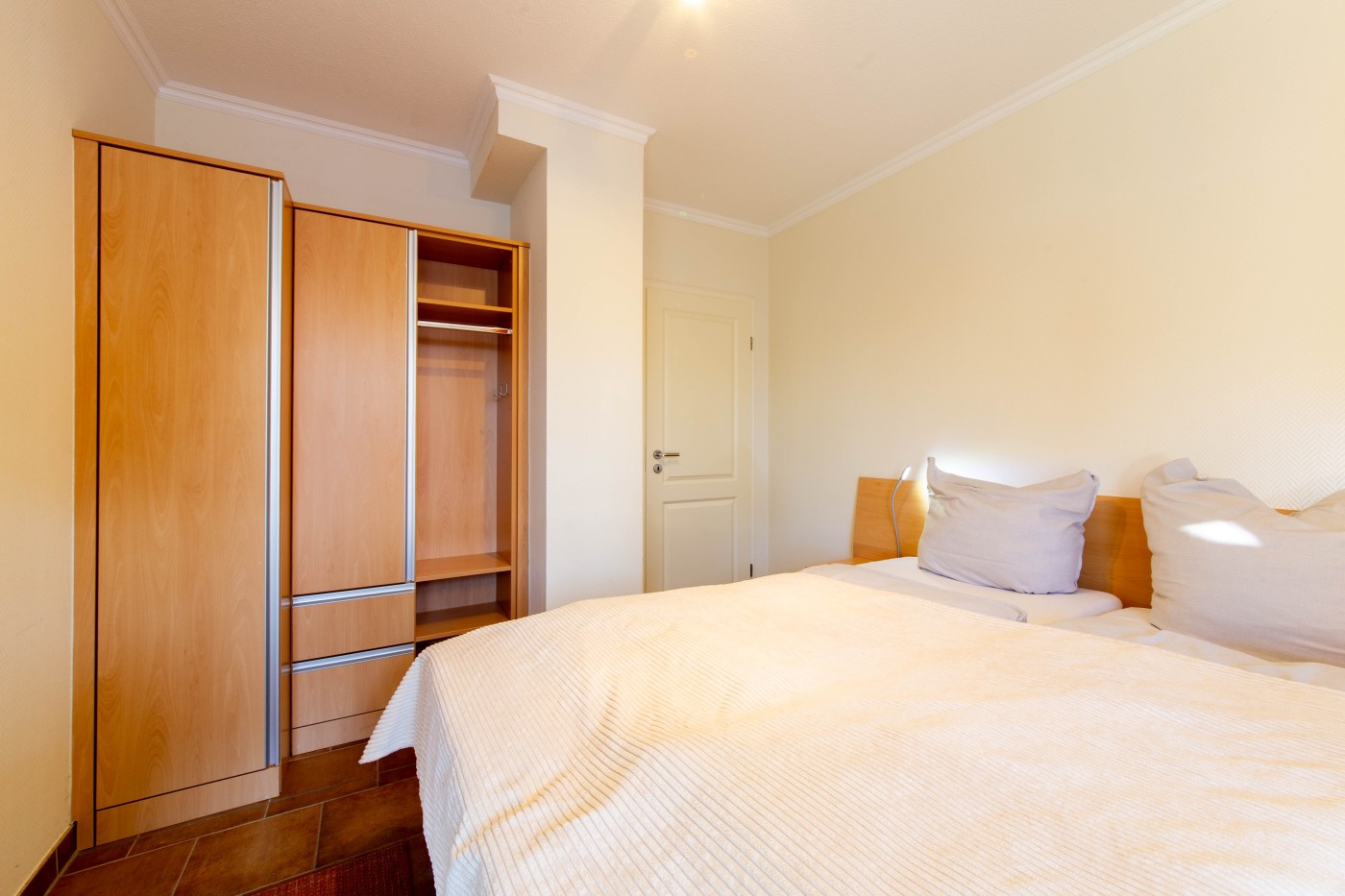 Zum Entertainmentpaket gehört der TV im Wohnraum, eine Stereoanlage und natürlich der WLAN-Zugang. Das kleinere Schlafzimmer ist ebenfalls mit einem Flat-TV ausgestattet.