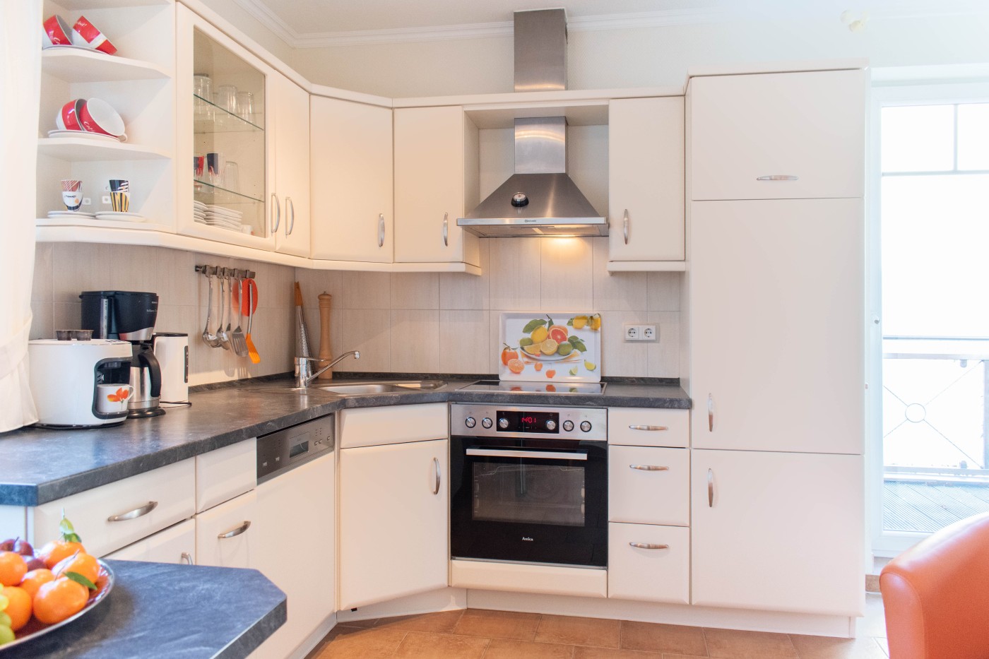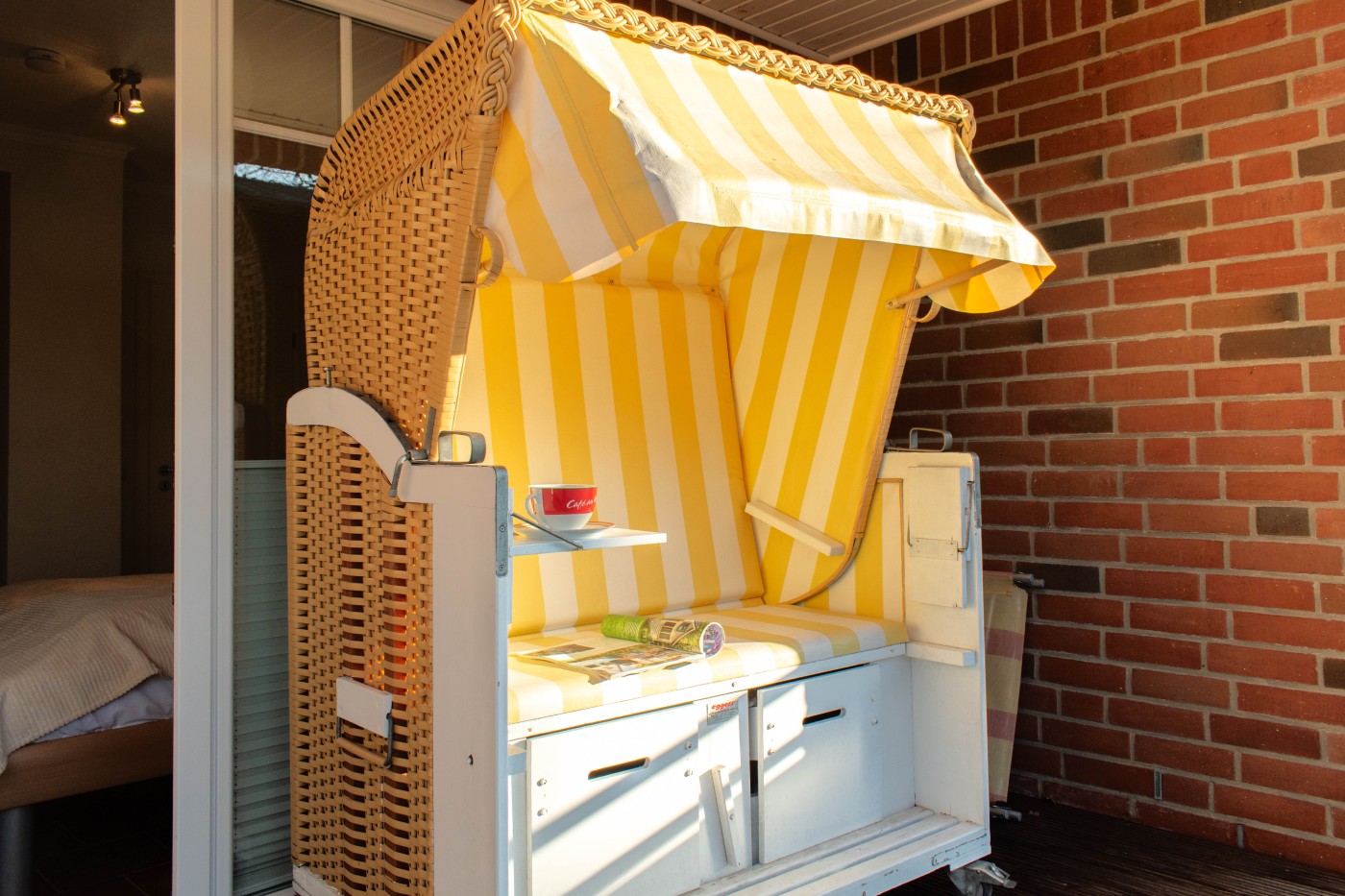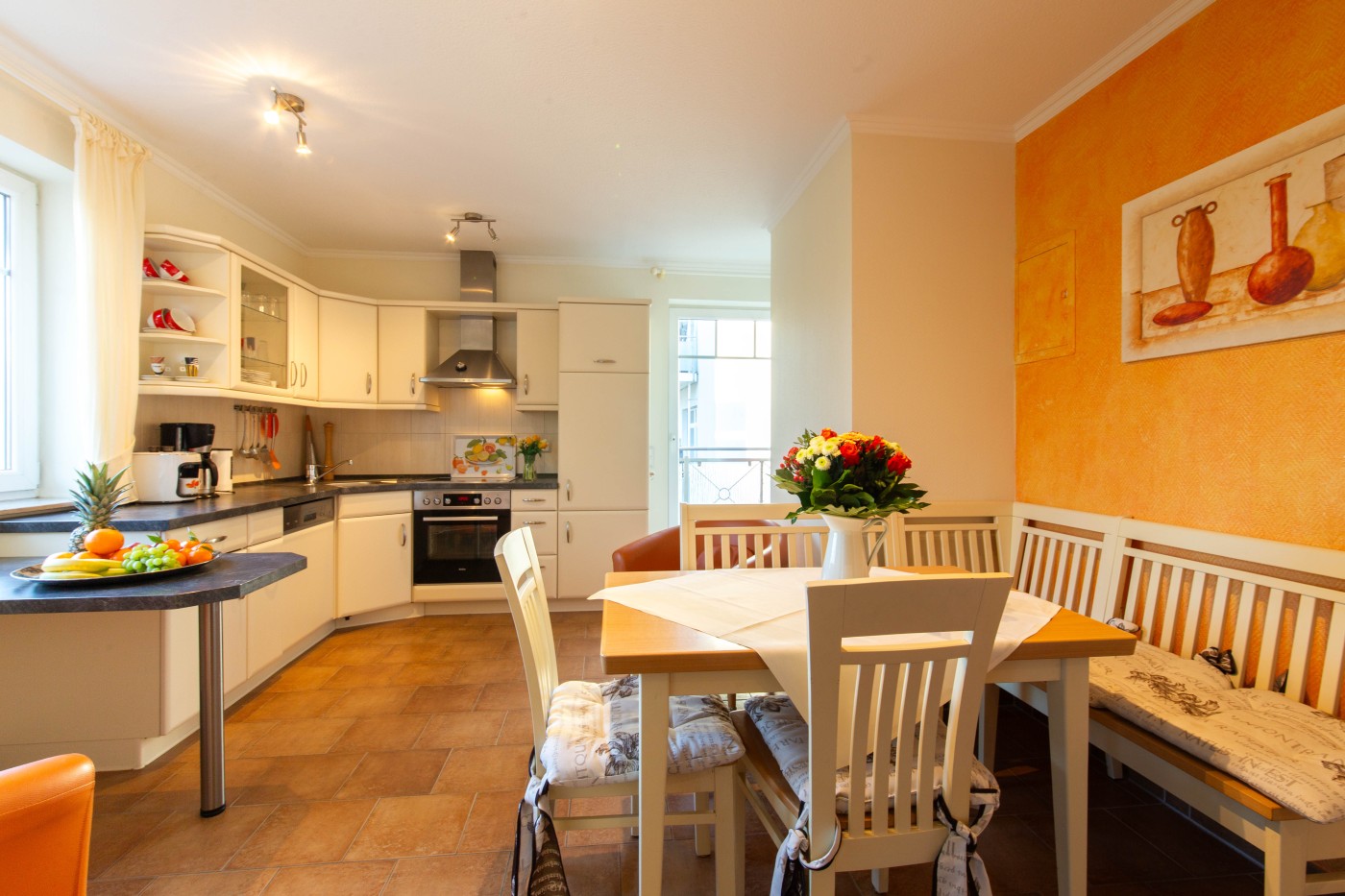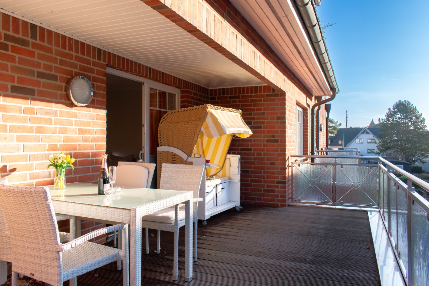 Die Ferienwohnung befindet sich auf der zweiten Etage einer gepflegten Ferienanlage und bietet mit 3 Zimmern Platz für vier Gäste. Die gemütliche Sitzecke lädt zum gemeinsamen Verweilen oder zu kuscheligen Filmabenden ein. Angrenzend ist der Zugang einem der möblierten Balkone. Der große Esstisch bietet Platz für vier Personen und befindet sich direkt neben der Küchenzeile. Dank der hervorragenden Küchenausstattung können Sie sich ganz dem Spaß am Kochen widmen. Neben der Küche befindet sich der Zugang zum zweiten Balkon. Das größere der beiden Schlafzimmer ist mit einem komfortablen Doppelbett und einem geräumigen Kleiderschrank ausgestattet, von hier erreichen Sie den dritten Balkon mit Strandkorb. Mit den beiden Einzelbetten sowie einem kleinen Schrank eignet es sich bestens als Kinderzimmer. Das Tageslichtbad ist mit einer ebenerdigen Dusche und einem beleuchteten Spiegel über dem Waschtisch ausgestattet. Insbesondere bei längeren Aufenthalten ist die Waschküche im Keller sehr praktisch, die Waschmaschine und den Trockner können Sie gegen Gebühr nutzen. Die Ferienwohnung lässt sich komfortabel mit einem Fahrstuhl erreichen. Genießen Sie auch die Vorzüge des Wellnessbereiches im Keller.