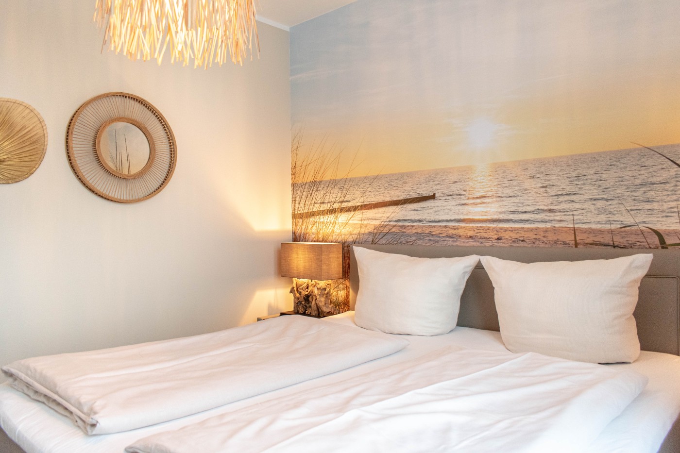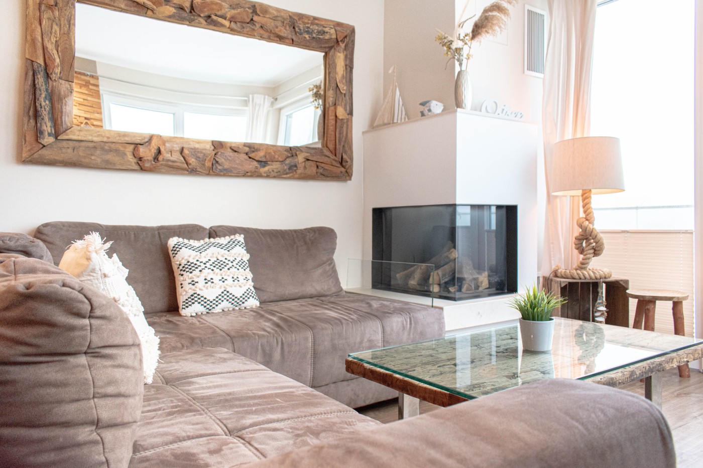 Das Interieur der Ferienwohnung Ocean House vereint nordische Klarheit mit sanfter Boho-Leichtigkeit. Helle Farben, natürliche Materialien und stilvolle Akzente schaffen ein harmonisches Ambiente, das gleichzeitig modern, edel und gemütlich wirkt – ein Ort, der inspiriert und zum Wohlfühlen einlädt.
