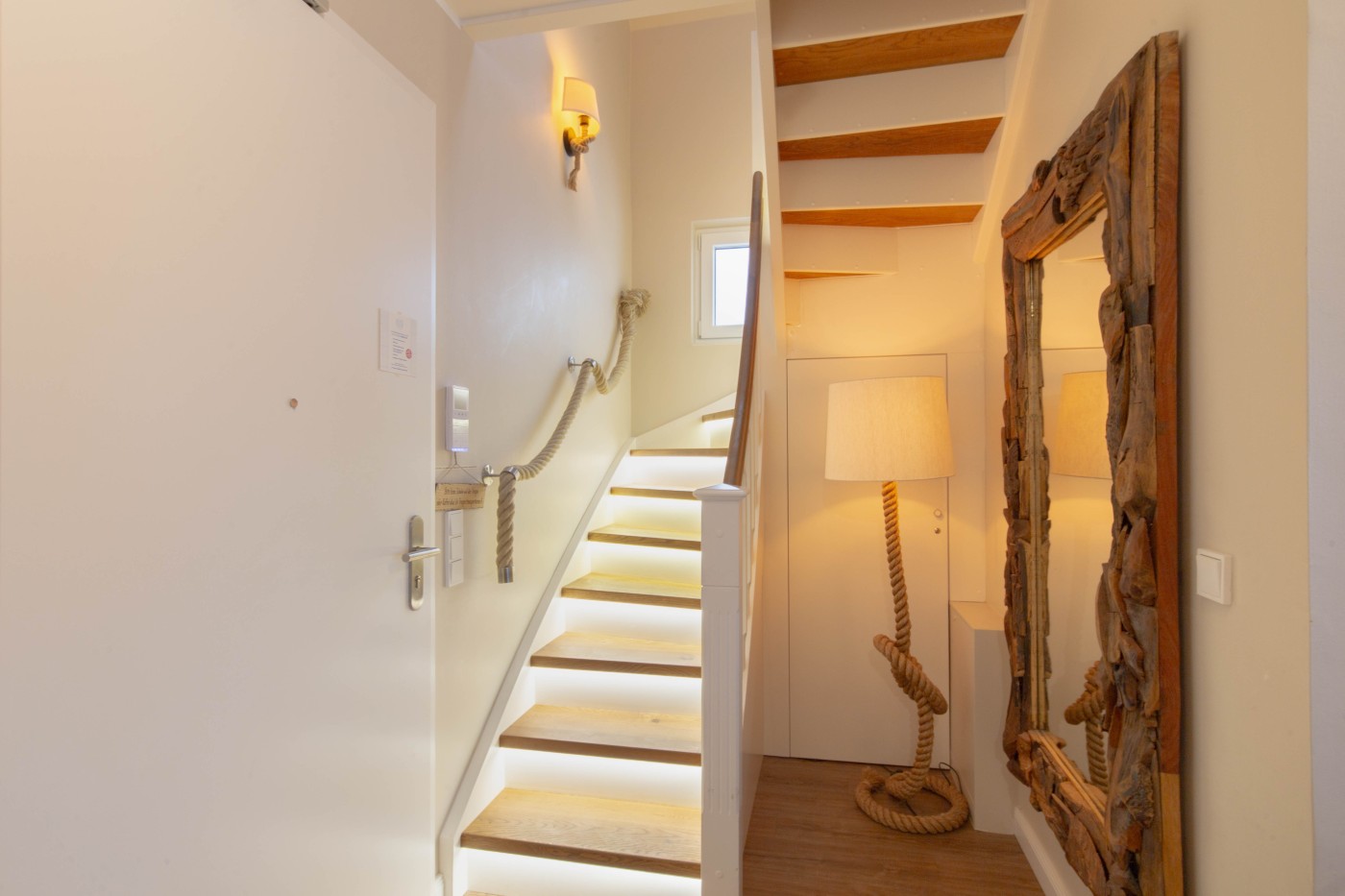 Die Maisonette-Wohnung überzeugt mit einem stilvollen Raumkonzept, hochwertigen Materialien und liebevollen Details. Im liebevoll gestalteten Wohnzimmer mit Kamin lassen sich gemütliche Abende verbringen, während man das Rauschen der Wellen hört oder den Blick auf die Ostsee genießt. Zwei komfortable Schlafzimmer, jeweils ausgestattet mit einem Boxspringbett (1,80 x 2,00 m), einem Smart-TV und beleuchteten Kleiderschränken, sorgen für erholsame Nächte und höchsten Komfort für bis zu vier Personen. Die moderne Küche mit Bartresen und Hockern ist vollständig und hochwertig ausgestattet, inklusive Induktionsherd, Backofen, Geschirrspüler und Kaffeemaschine – und lädt dazu ein, auch im Urlaub kulinarische Momente zu genießen. Ob ein entspanntes Frühstück mit Meerblick oder ein gemeinsames Abendessen im stilvollen Ambiente, hier fehlt es an nichts. Die elegante, beleuchtete Holztreppe führt in die obere Etage und unterstreicht das durchdachte Design der Wohnung. Ein besonderes Highlight sind die zwei modernen Bäder, die mit stilvollem Design und Komfort überzeugen. Eines davon verfügt über eine Sauna und eine Whirlpool-Badewanne und einen stilvollen Wasserbrunnen, die zusammen einen echten Wellnessbereich entstehen lassen - und selbst von hier genießen Sie den direkten Blick auf die Ostsee. Beide Bäder sind mit einer Deckenbeleuchtung in Farblichttherapie ausgestattet sind - perfekt, um nach einem Tag am Meer zur Ruhe zu kommen. Im Obergeschoss befindet sich außerdem ein Homeoffice Arbeitsplatz sowie ein Getränkekühlschrank. Auf dem Balkon genießen Sie den Blick auf die Promenade und die Ostsee. Ein wunderbarer Ort, um den Tag bei einem Glas Wein und dem Klang der Wellen ausklingen zu lassen.