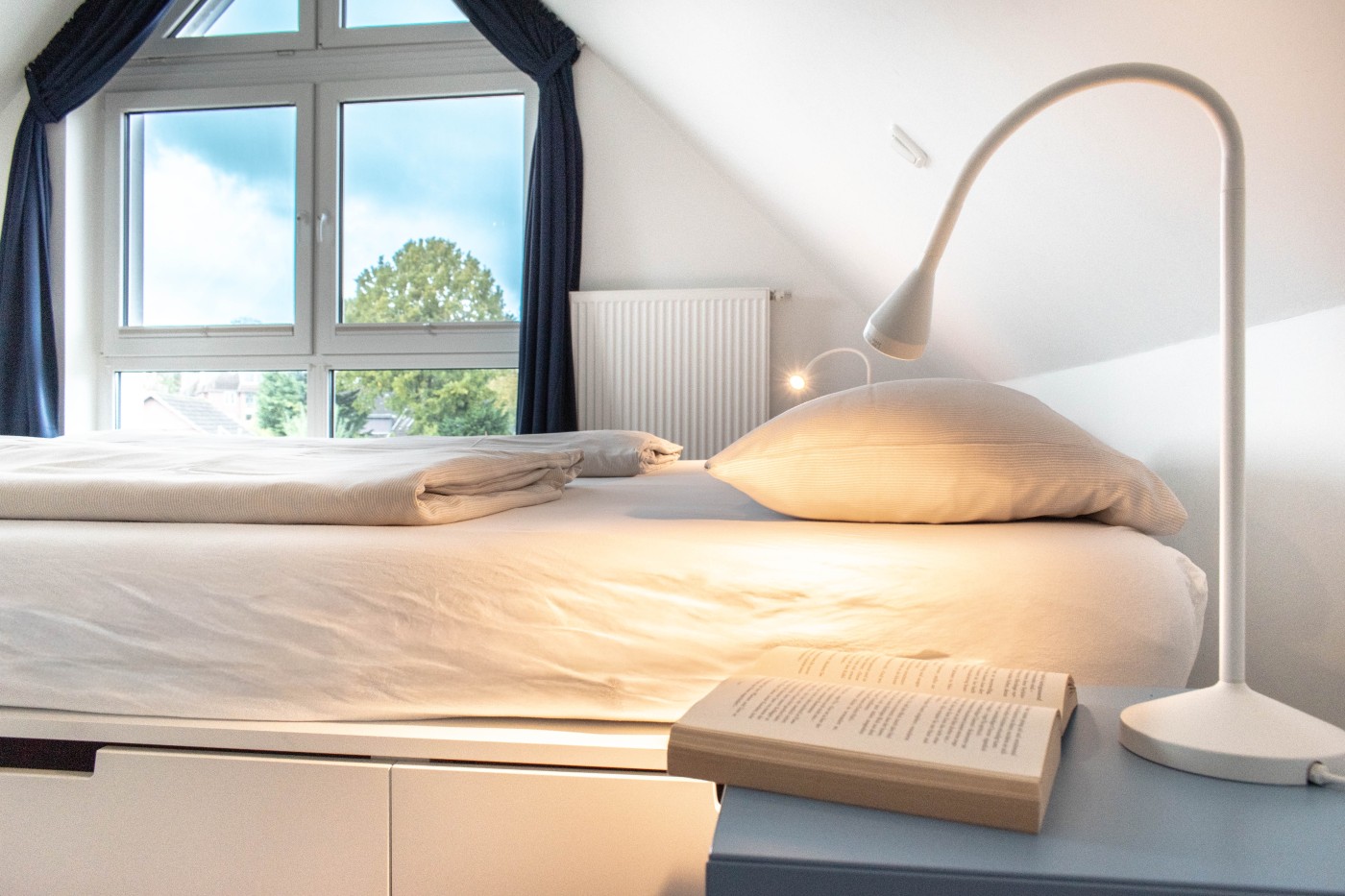107 m² werden mit moderner und hochwertiger Einrichtung optimal genutzt und lassen keine Wünsche offen. Das cleane Design wird durch blaue Farbakzente aufgefrischt.