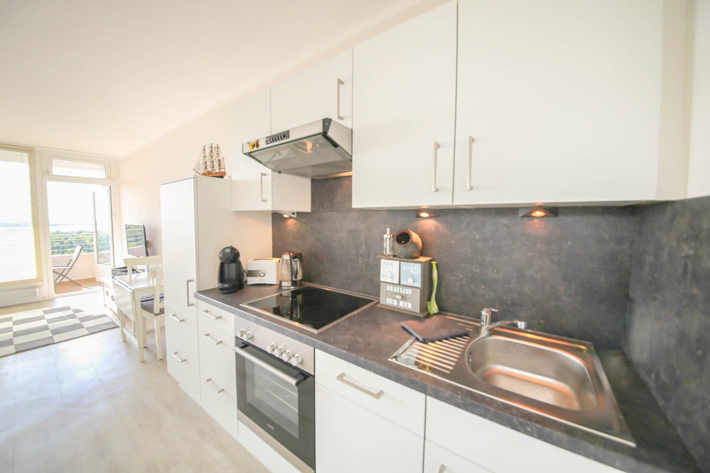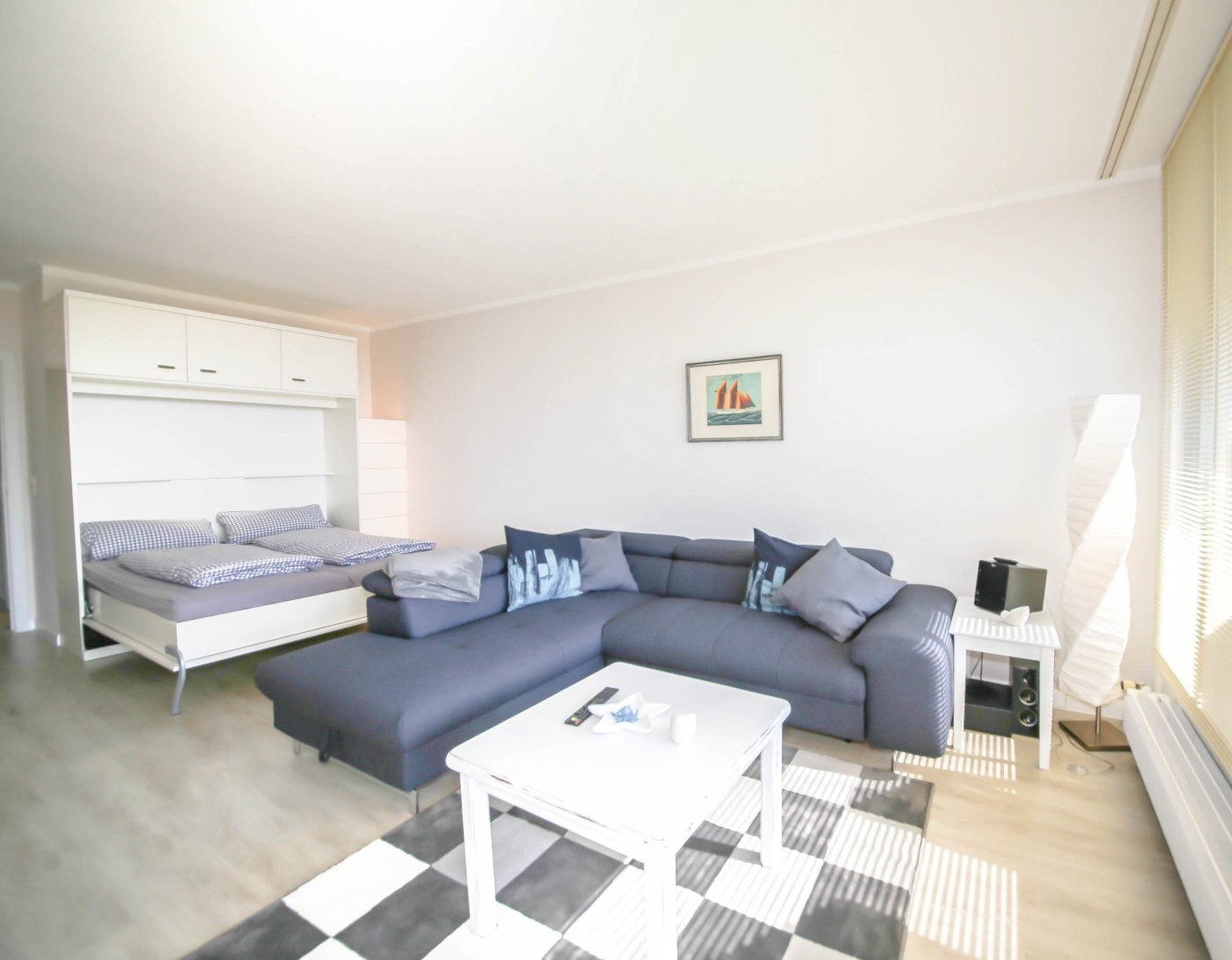 Ein Zimmer mit Doppelbett, Balkon und Küche bietet Platz für zwei Gäste. Bodentiefe Fenster im Wohnzimmer sorgen den ganzen Tag für eine helle und freundliche Atmosphäre. Von hier aus gelangt man auch auf den möblierten Balkon mit seitlichem Meerblick. Im Wohnbereich befindet sich ein Doppelbett (Schrankbett 1,60er Breite). Die offene Küche ist komplett ausgestattet und lässt keine Wünsche offen. Das moderne Badezimmer verfügt über eine Dusche und ein WC.