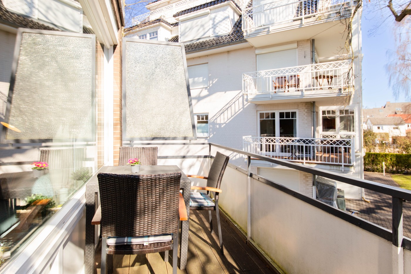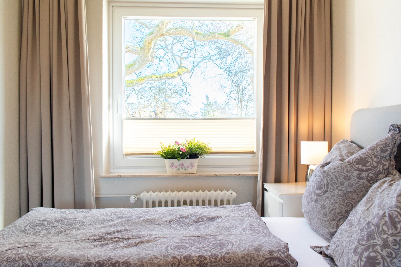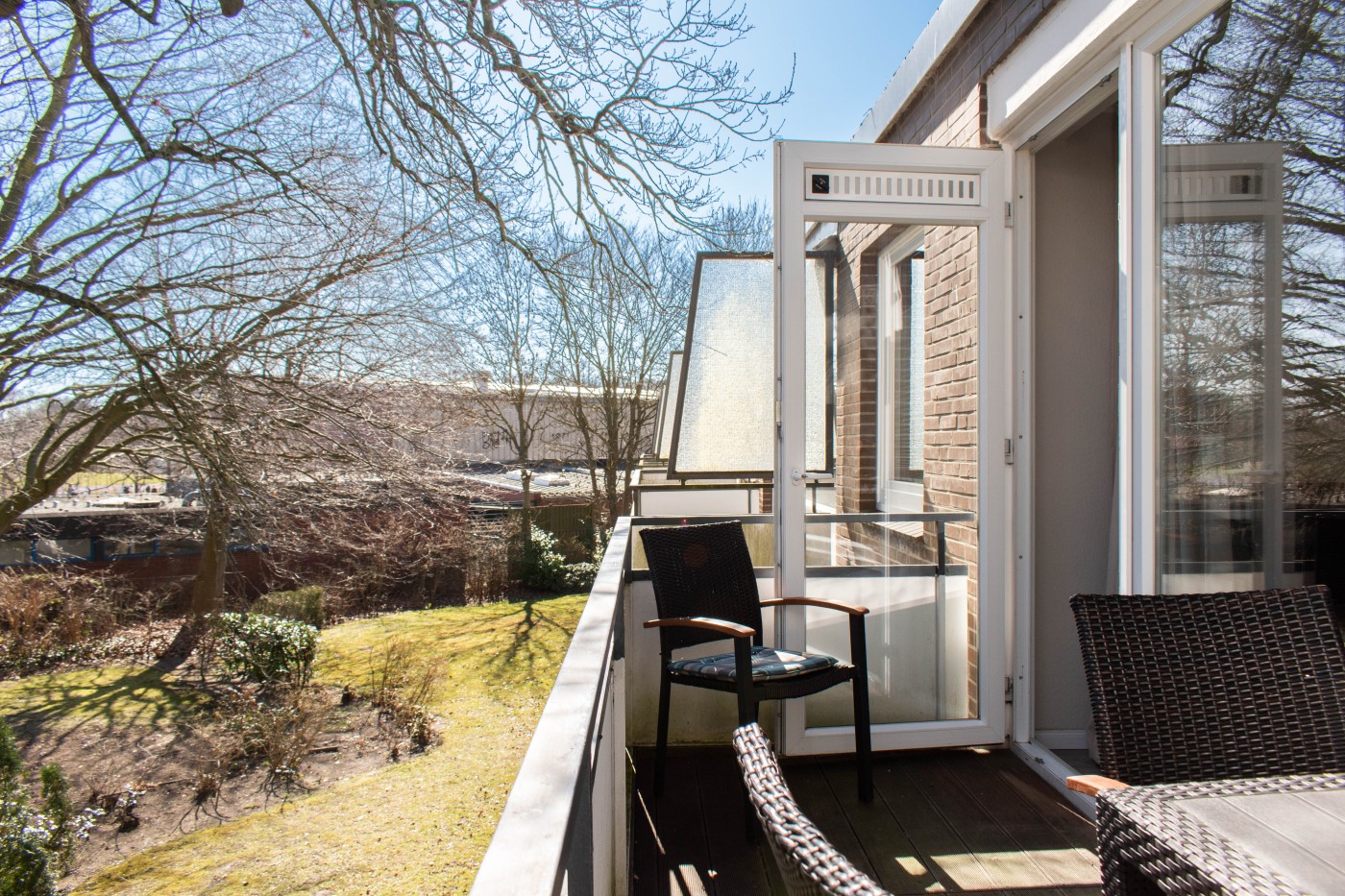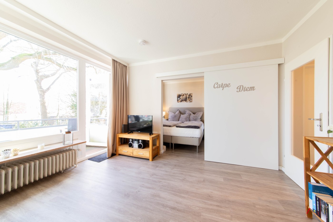 Die Wohnung verfügt über ein gemütliches Schlafzimmer zur Gartenseite mit einem komfortablen Doppelbett (Boxspringbett, 160 x 200 cm), das für erholsame Nächte sorgt. Das Schlafzimmer kann mit blickdichten Gardinen abgedunkelt werden, zusätzlich gibt es noch ein Plissee. Der helle Wohn- und Essbereich lädt zum Verweilen ein: Hier finden Sie einen Esstisch mit vier Stühlen sowie eine gemütliche, ausziehbare Schlafcouch, die bei Bedarf zusätzlichen Schlafplatz bietet. Die moderne Einbauküche ist komplett ausgestattet und verfügt unter anderem über einen Geschirrspüler, sodass Sie Ihren Aufenthalt ganz entspannt genießen können. Das helle Badezimmer ist modern und komfortabel gestaltet. Es verfügt über einen großzügigen Waschtisch mit viel Ablagefläche, einen großen Spiegel sowie eine bodentiefe, begehbare Dusche, die für ein angenehmes und entspanntes Duscherlebnis sorgt. Vom Wohnbereich aus gelangen Sie auf den Balkon, der einen schönen Blick ins Grüne bietet – der perfekte Ort für ein Frühstück an der frischen Luft oder einen ruhigen Ausklang des Tages. Ein Hund darf gegen Gebühr mitgebracht werden.