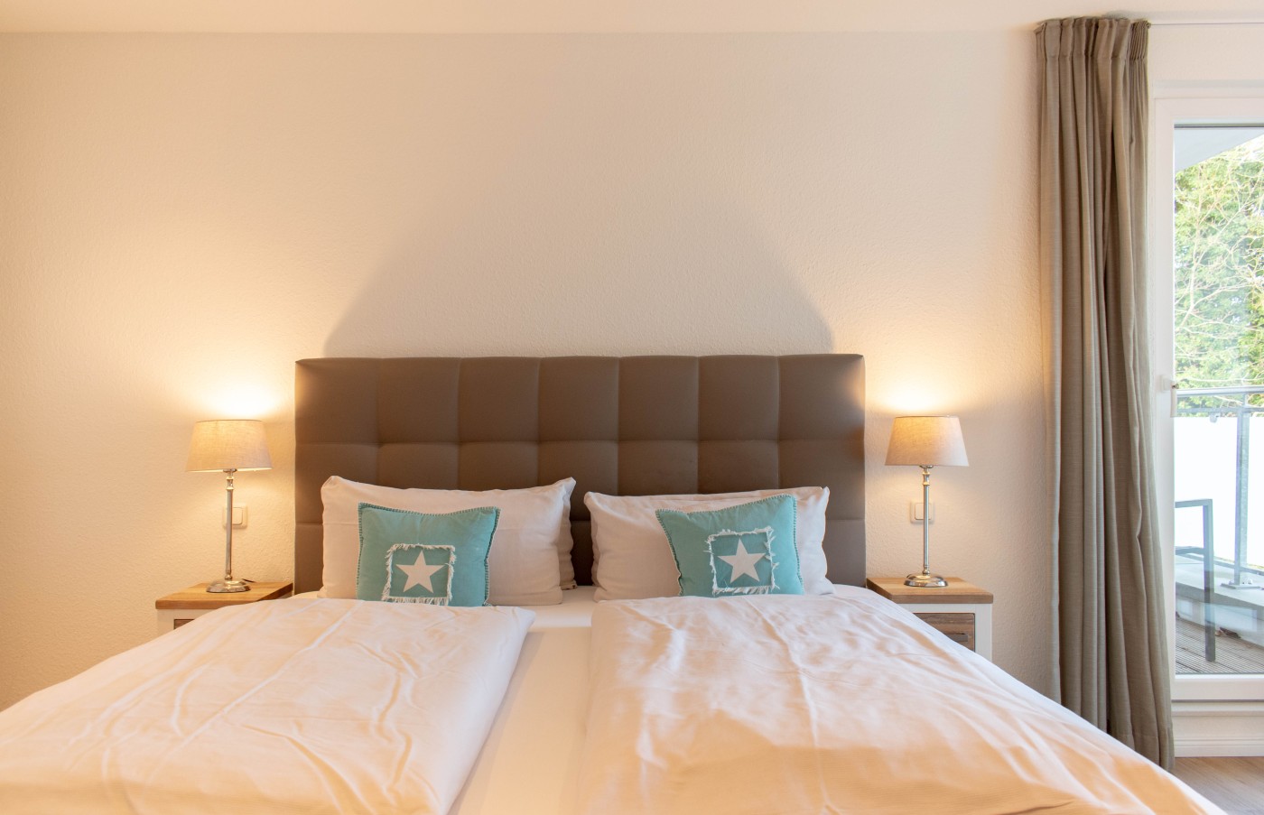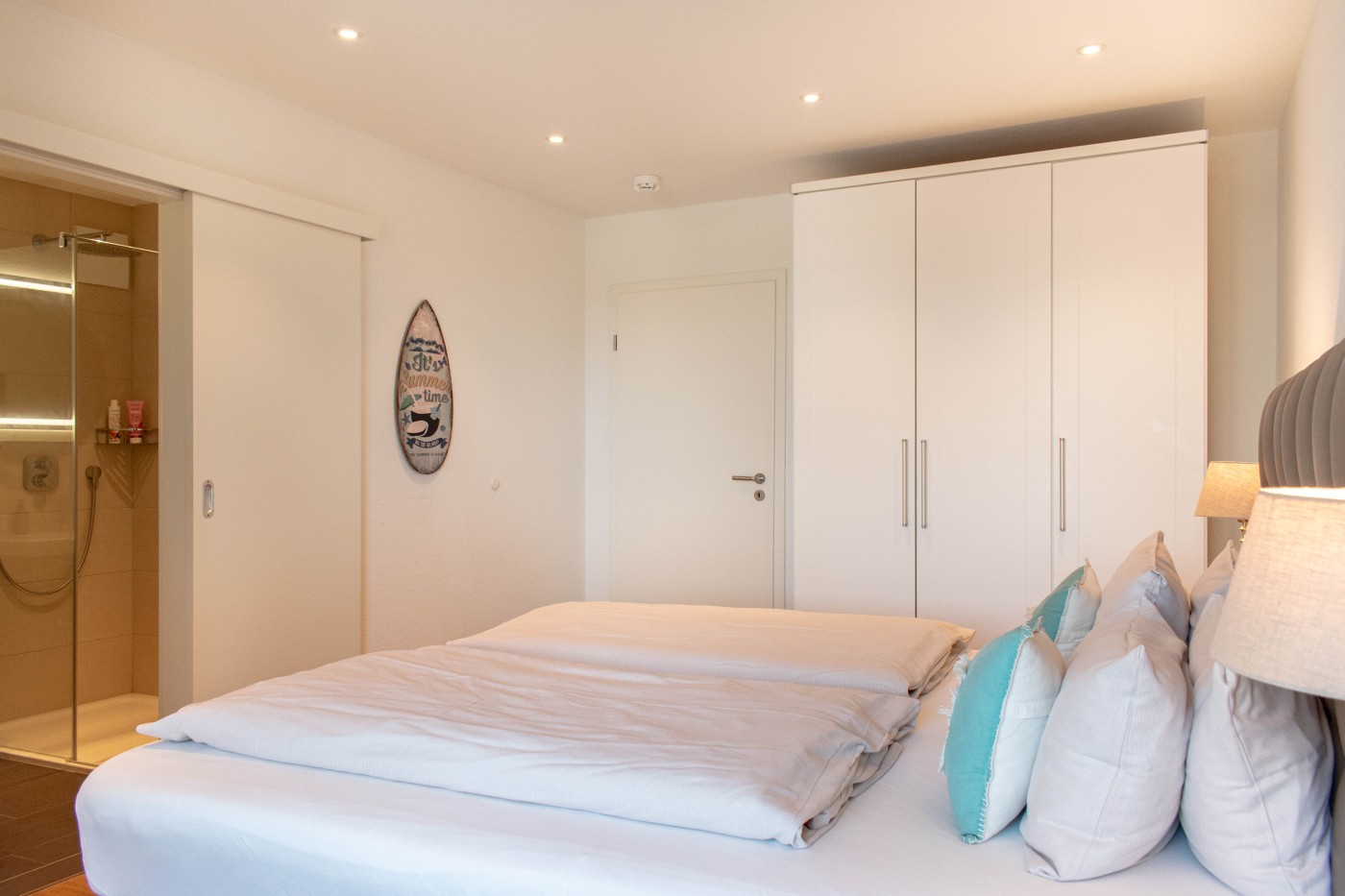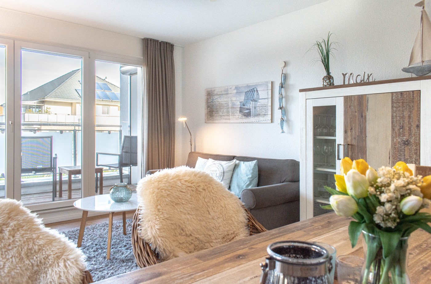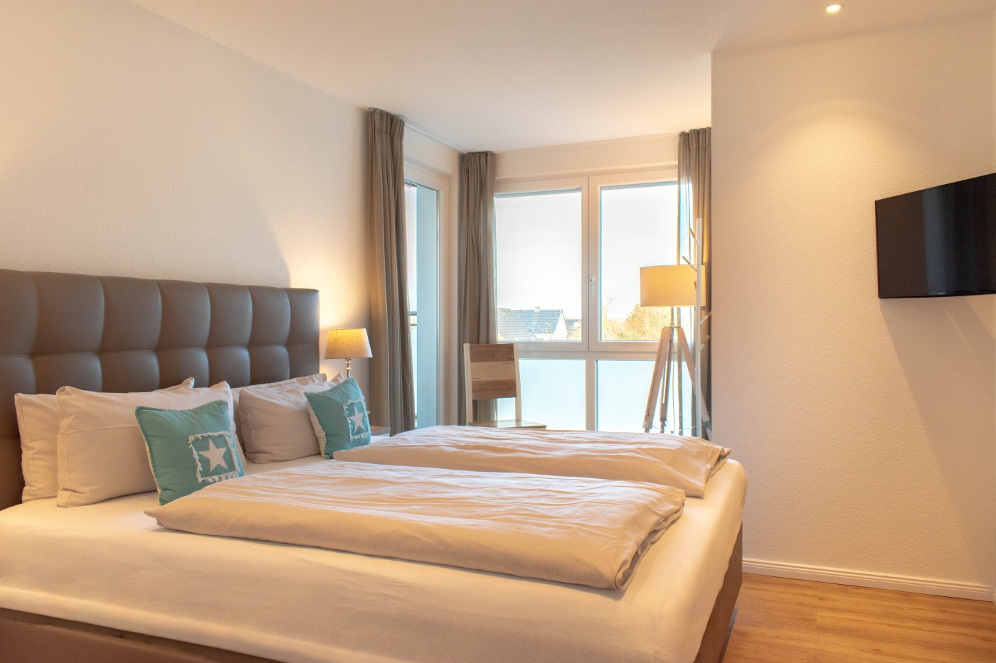Die Wohnung verfügt über einen Wohn- und Küchenbereich sowie zwei Schlafzimmer und bietet Platz für sechs Gäste. In beiden Schlafzimmern befinden sich bequeme Designer Doppelbetten (180 x 200) mit Kleiderschränken und Flat-Fernseher. Auf allergikerfreundliches Material wurde geachtet. Im Wohnzimmer befindet sich eine bequeme Schlafcouch (160 x 200). Vom Wohnzimmer aus gelangt man auf den möblierten Balkon. Die offene Küche ist voll ausgestattet und lässt keine Wünsche offen. Sogar ein Smoothie-Mixer und eine Espresso-Maschine sind vorhanden. Die Wohnung verfügt über zwei Badezimmer. Das Badezimmer verfügt über eine Dusche und ein WC. Des Weiteren gibt es noch ein separates Badezimmer mit einer Badewanne und einem WC. Elektrische Rollläden sorgen für einen angenehmen Schlafkomfort. Ebenso bietet eine Fußbodenheizung dem Gast eine tolle Wohlfühlatmosphäre.
