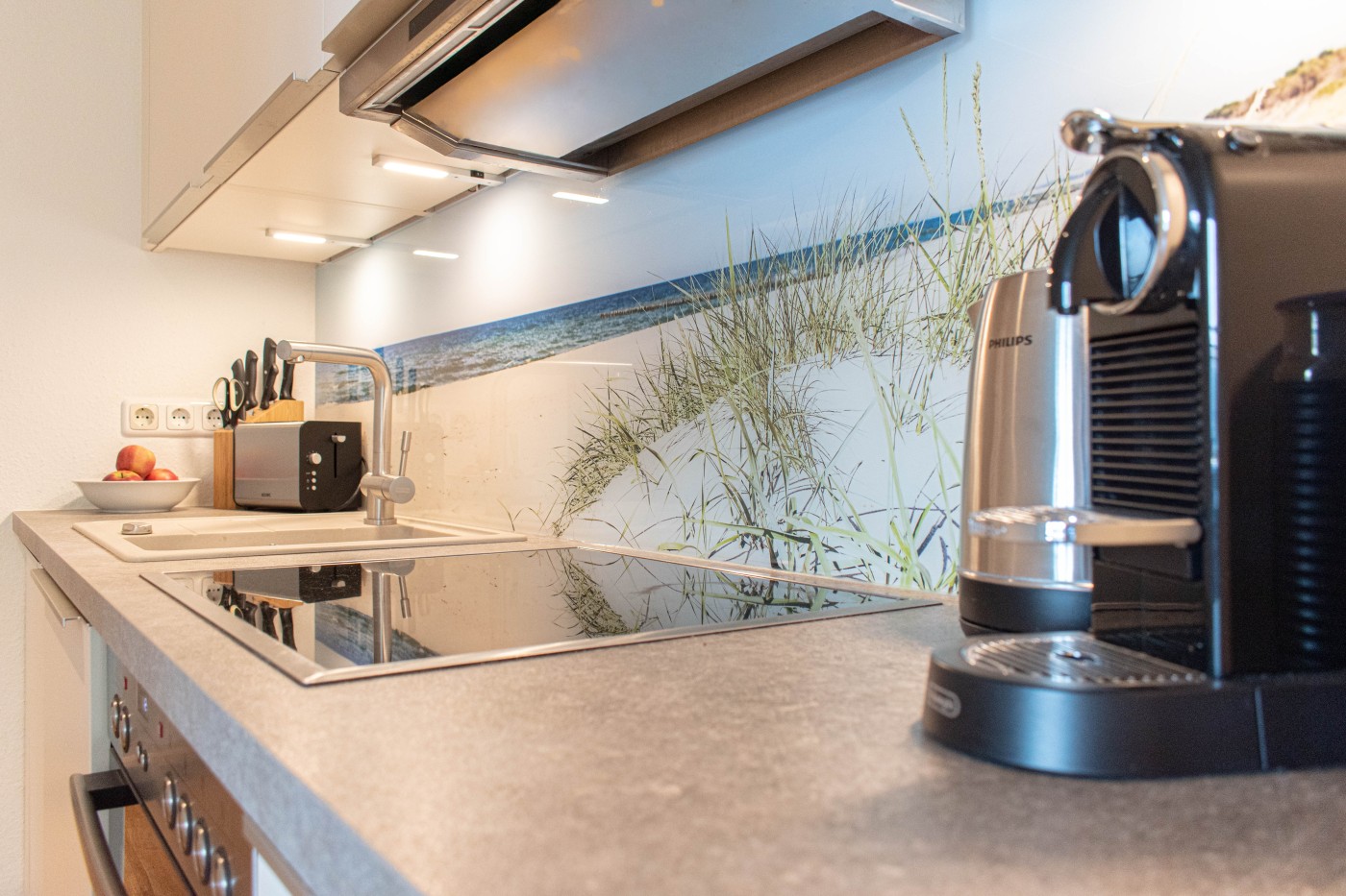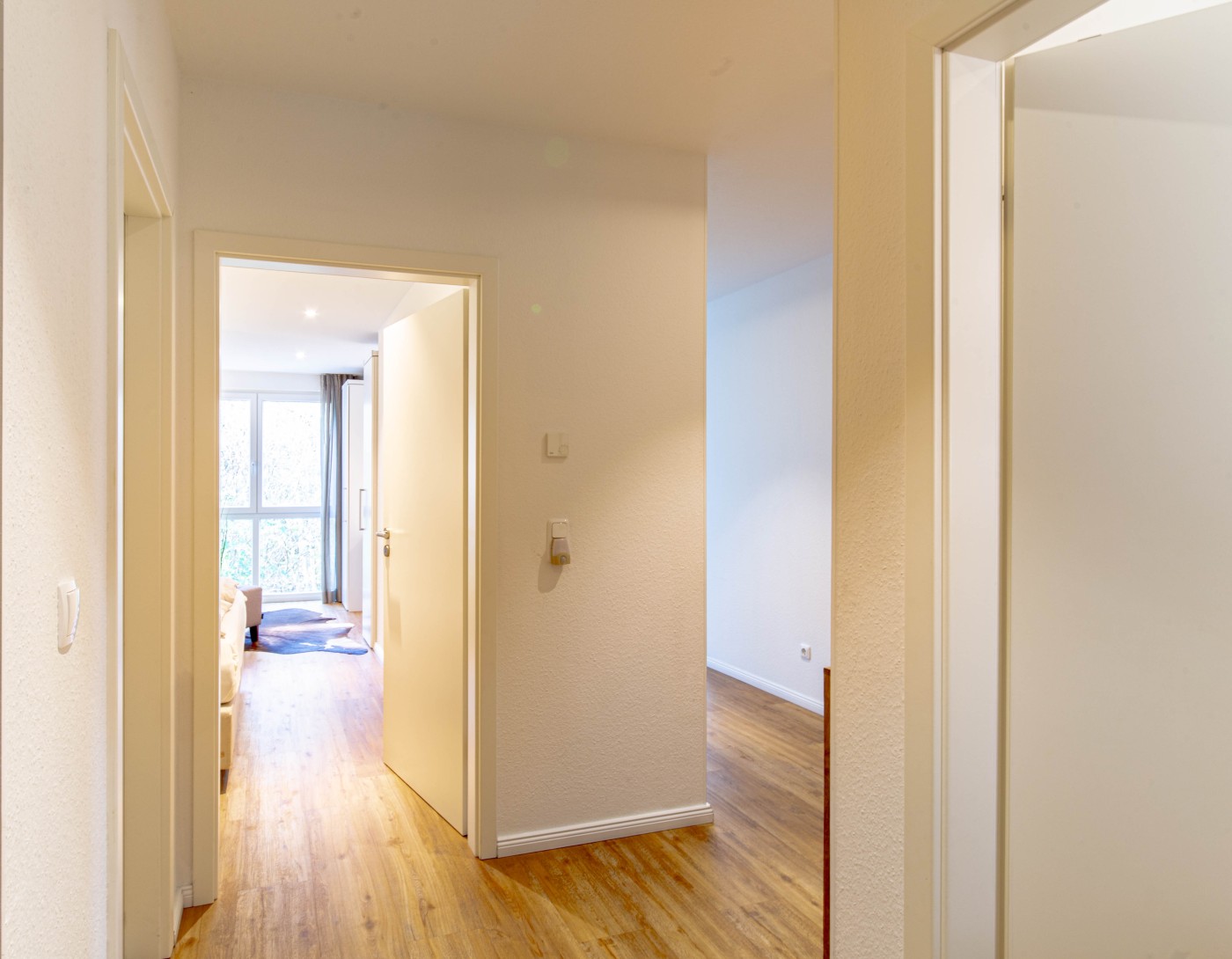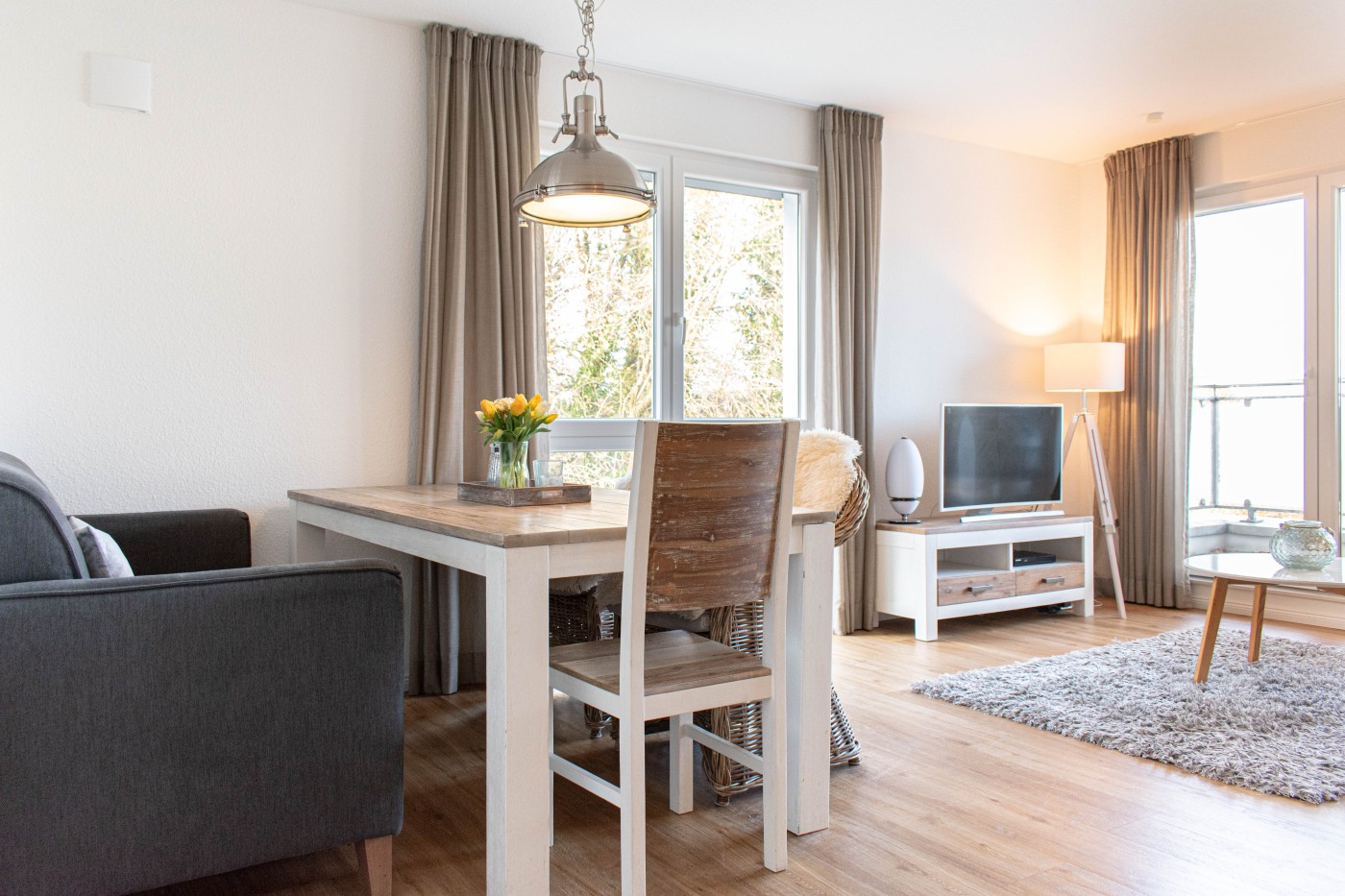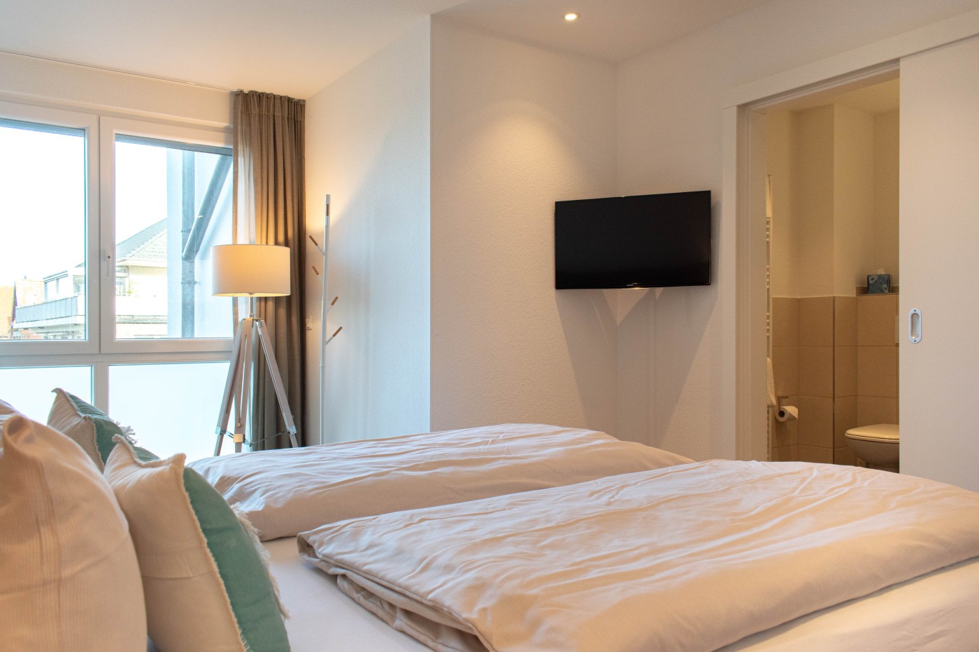 Die Wohnung verfügt über einen Wohn- und Küchenbereich sowie zwei Schlafzimmer und bietet Platz für sechs Gäste. In beiden Schlafzimmern befinden sich bequeme Designer Doppelbetten (180 x 200) mit Kleiderschränken und Flat-Fernseher. Auf allergikerfreundliches Material wurde geachtet. Im Wohnzimmer befindet sich eine bequeme Schlafcouch (160 x 200). Vom Wohnzimmer aus gelangt man auf den möblierten Balkon. Die offene Küche ist voll ausgestattet und lässt keine Wünsche offen. Sogar ein Smoothie-Mixer und eine Espresso-Maschine sind vorhanden. Die Wohnung verfügt über zwei Badezimmer. Das Badezimmer verfügt über eine Dusche und ein WC. Des Weiteren gibt es noch ein separates Badezimmer mit einer Badewanne und einem WC. Elektrische Rollläden sorgen für einen angenehmen Schlafkomfort. Ebenso bietet eine Fußbodenheizung dem Gast eine tolle Wohlfühlatmosphäre.