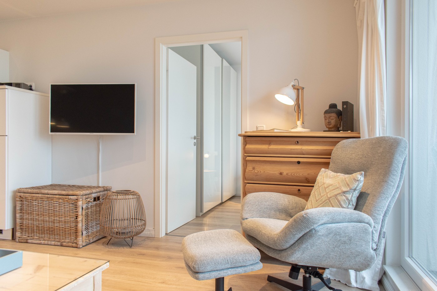 Die Wohnung verfügt über einen Wohn- und Küchenbereich sowie einem Schlafzimmer und bietet Platz für vier Gäste. In dem separatem Schlafzimmer befindet sich ein bequemes Doppelbett (180 x 200) mit Kleiderschrank und Flat-Fernseher. Im Wohnzimmer dient eine bequeme Schlafcouch (160 x 200) als Schlafmöglichkeit. Vom Wohnzimmer aus gelangt man auf den möblierten Balkon. Die Küche ist voll ausgestattet und lässt keine Wünsche offen. Das moderne Badezimmer verfügt über eine Dusche und ein WC. Elektrische Rollläden sorgen für einen angenehmen Schlafkomfort. Ebenso bietet eine Fußbodenheizung dem Gast eine tolle Wohlfühlatmosphäre.
